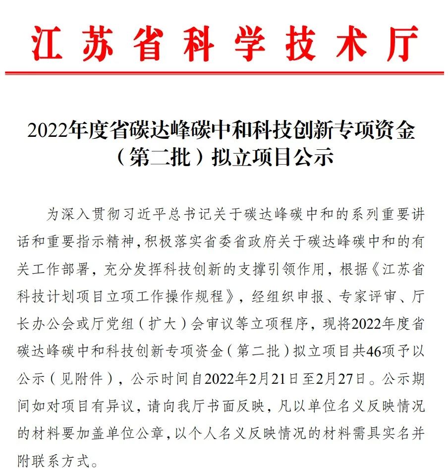 2月21日,江蘇省科技廳對2022年度省碳達峰碳中和科技創新專項資金(第二批)擬立項目共46項進行公示,其中,重大創新載體建設項目共擬立項6個。